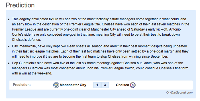 Mindkét csapat győzelme mellett szólnak érvek. A City mellett szól a hazai pálya, az erős és gyors támadósora, a Chelsea mellett szól, hogy Conte számára tulajdonképp, ha nem kap ki, továbbra is Pepiék előtt fog állni a Chelsea (mégha a tabellán a vezető pozíciót csak a győzelem garantálja is), valamint az is, hogy rendkívül erős a kontratámadás során felvonultatható névsora.